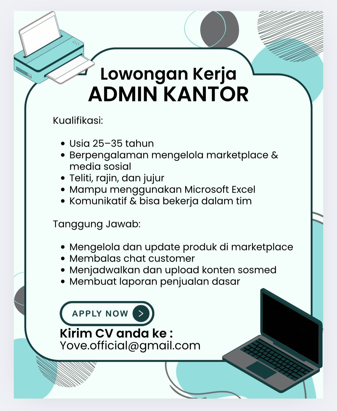 Dibutuhkan segera ADMIN KANTOR untuk Yove Official di Denpasar, Bali.