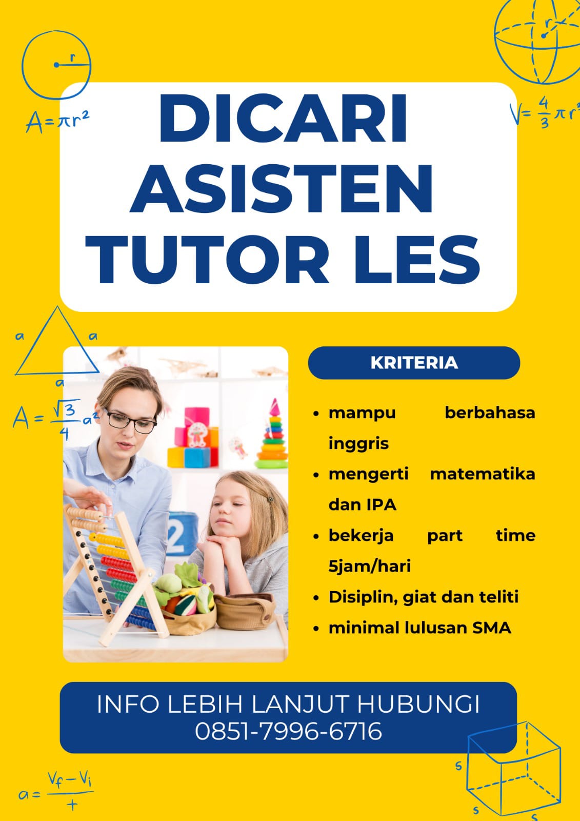 Dibutuhkan segera Asisten Tutor Les penempatan di Denpasar, Bali.