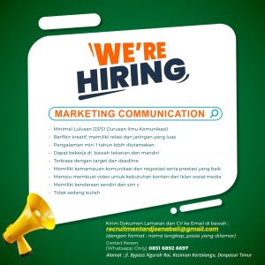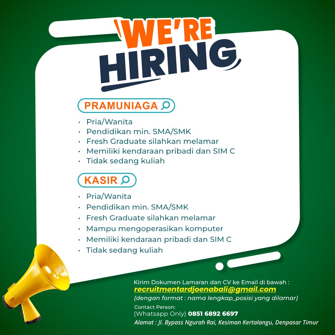 Silahkan kirimkan cv dan lamaran anda ke Email atau kontak yg tertera pada gambar.