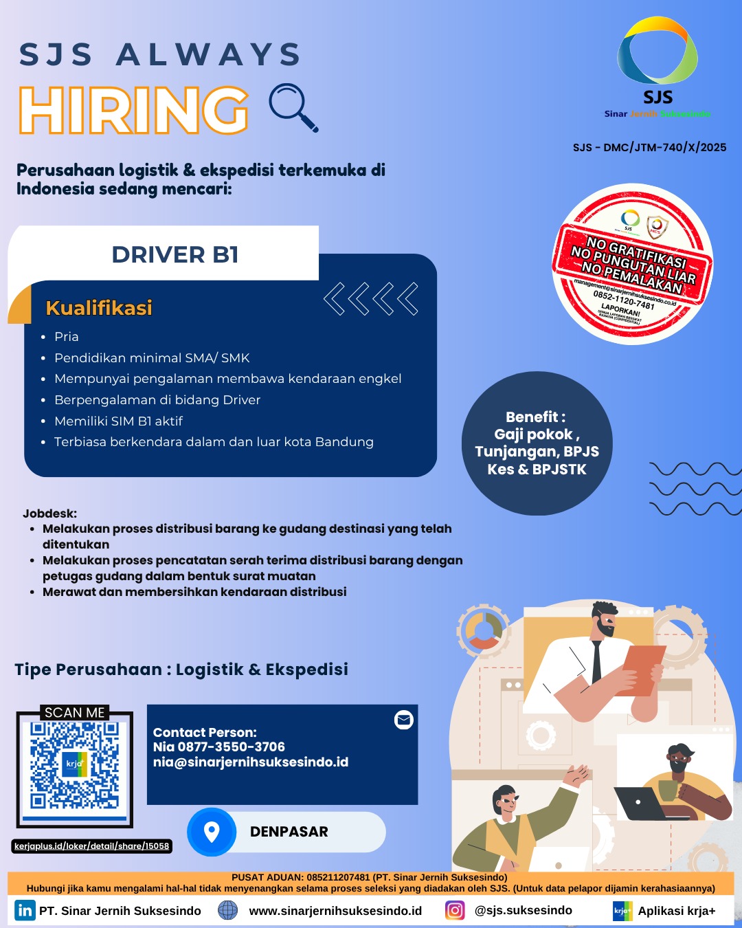 Dibutuhkan segera DRIVER B1 untuk SJS di Denpasar, Bali.