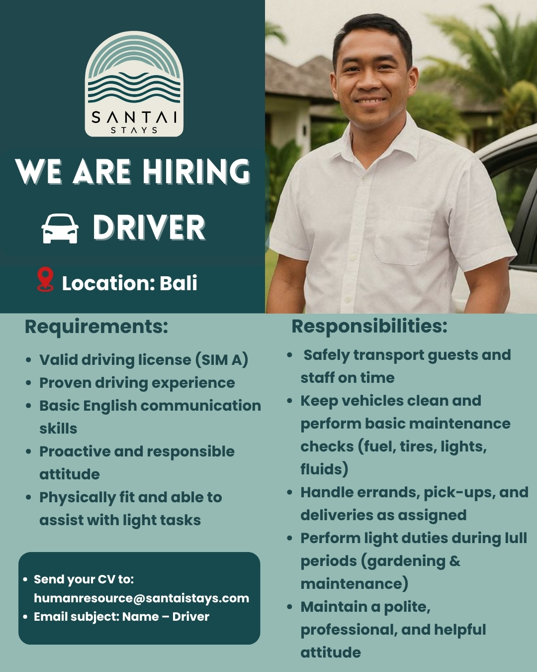 Join Santai Stays, a boutique villa management company in Bali. We’re looking for a reliable and proactive Driver to support guest transportation.