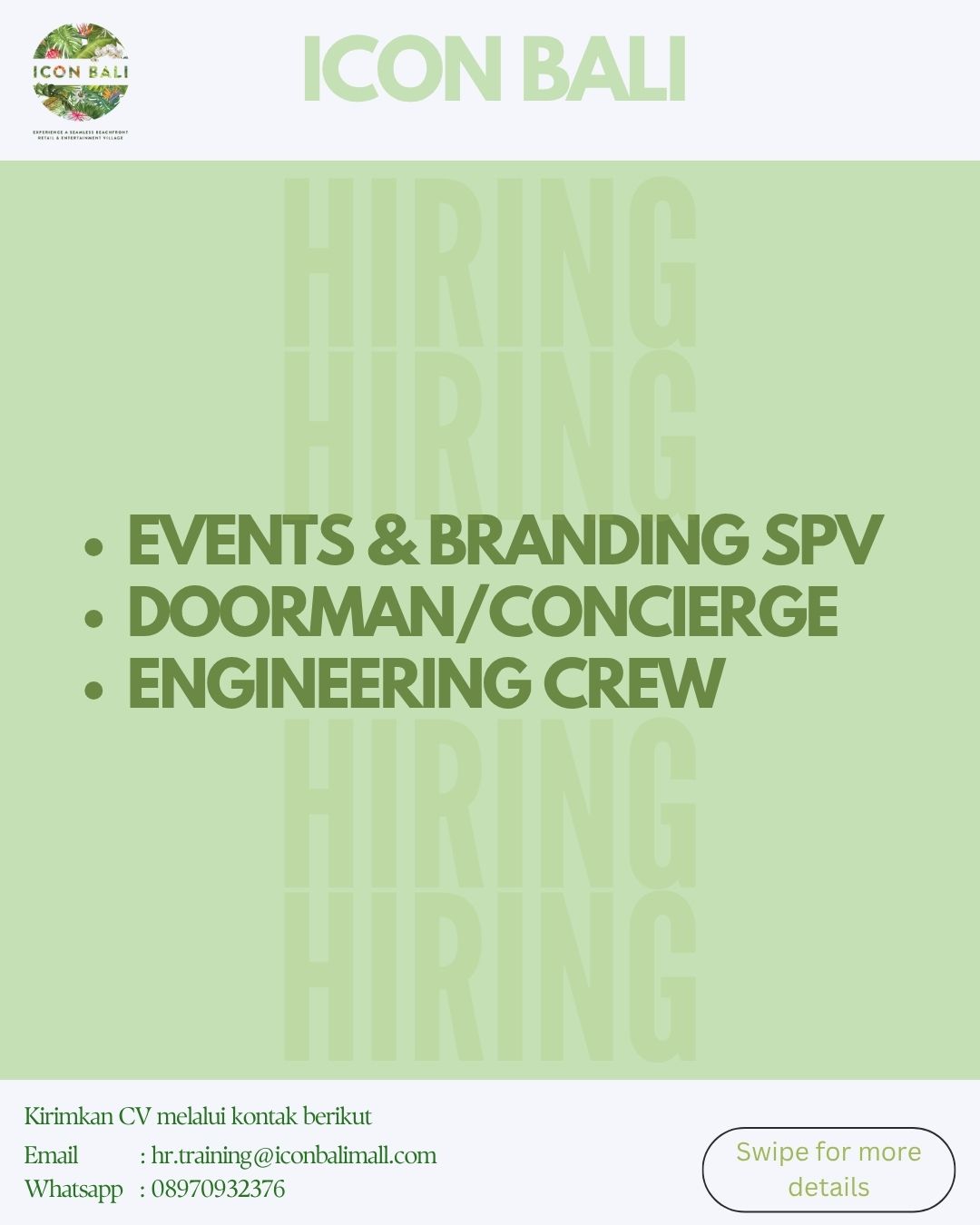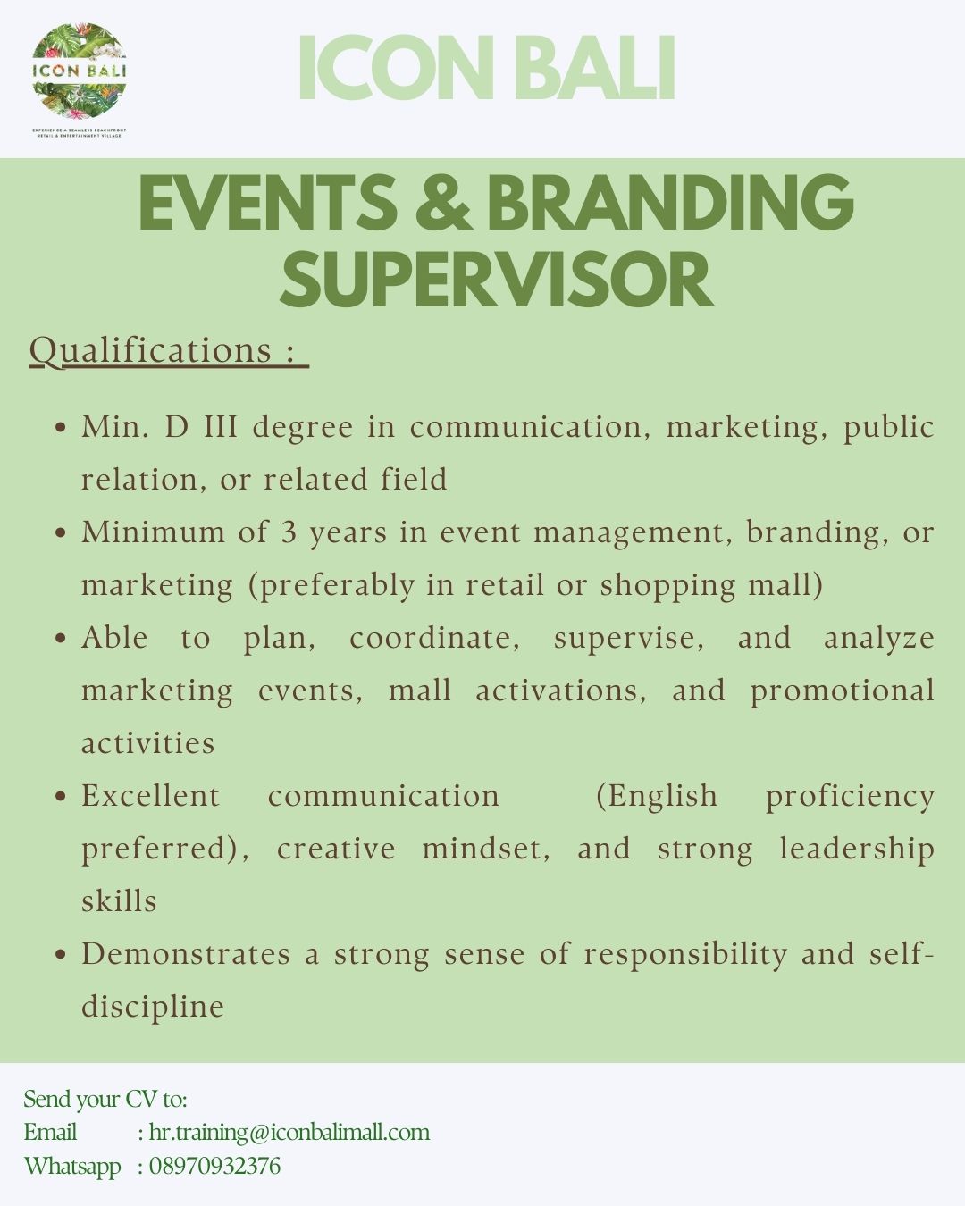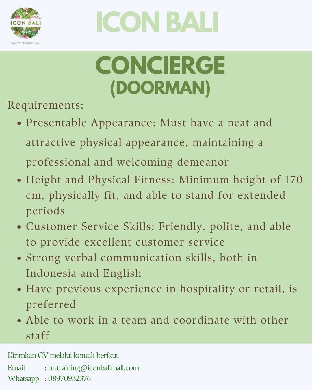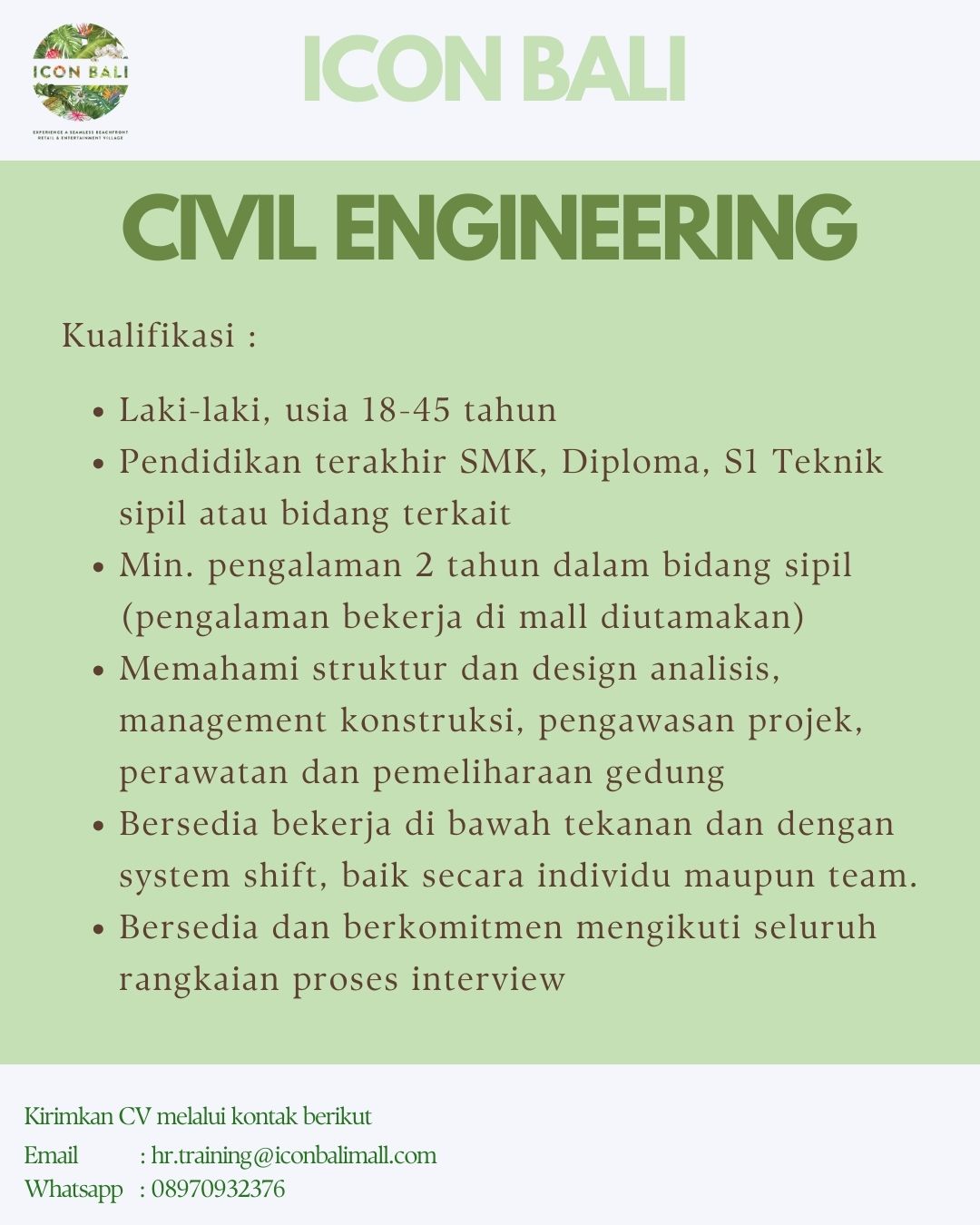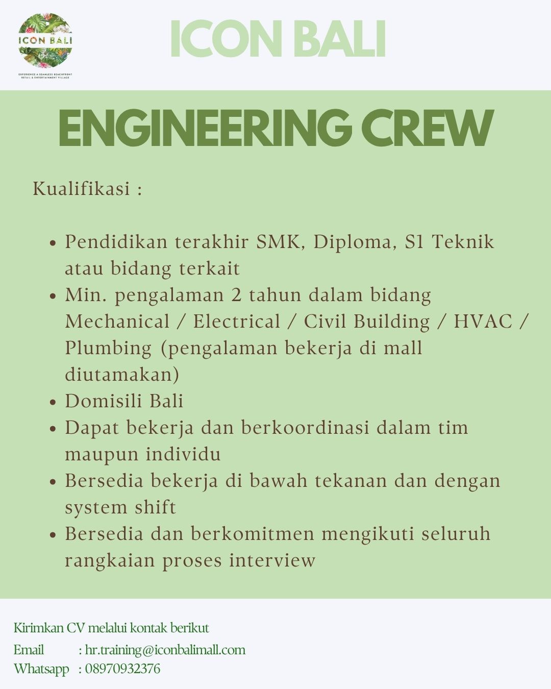 Kirimkan cv dan lamaran anda ke Email atau WA yg tertera pada gambar.
