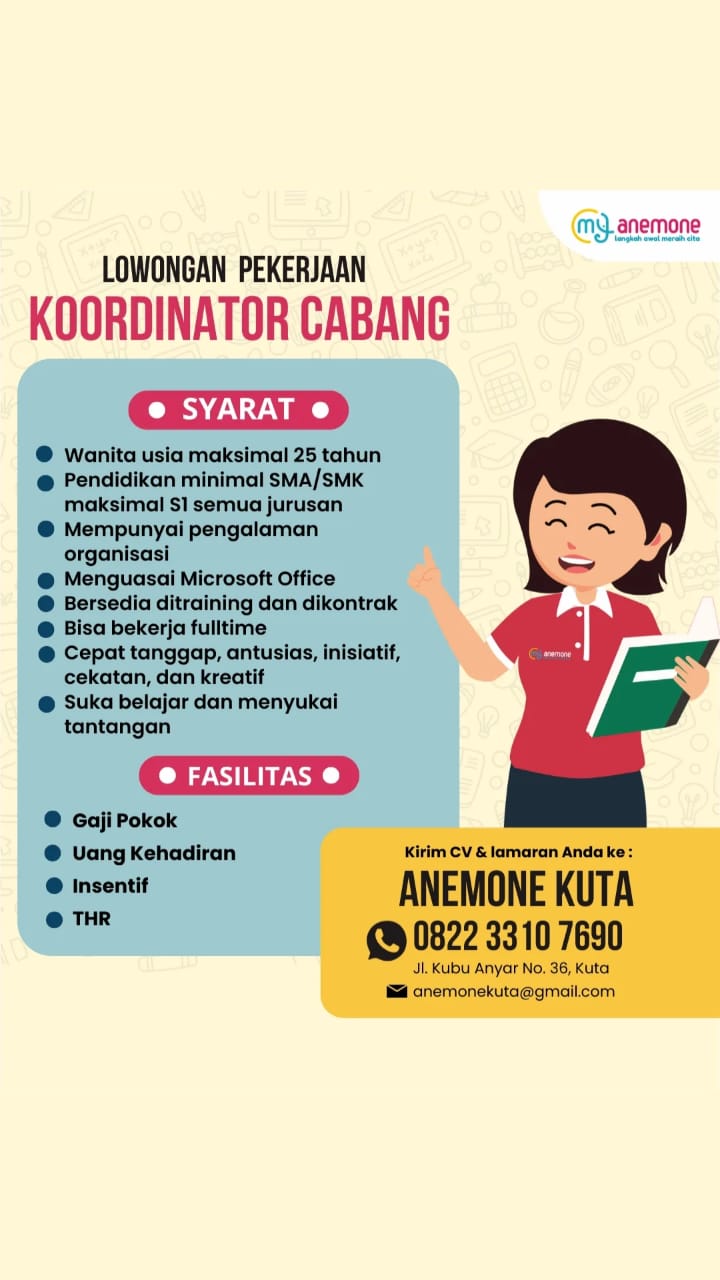 Dibutuhkan segera Koordinator Cabang untuk Anemone Kuta, Bali.