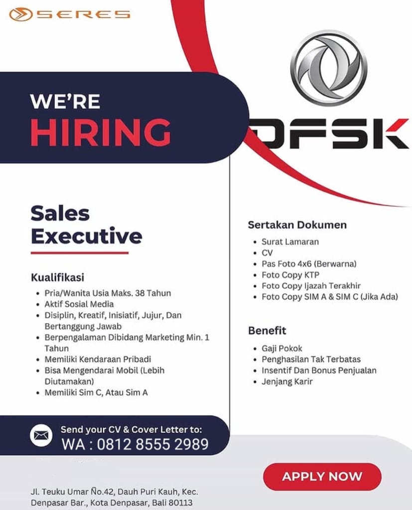 💼Dibutuhkan segera Sales Executive untuk PT. Bevos Auto Mandiri DFSK Bali (SERES) di Denpasar, Bali.