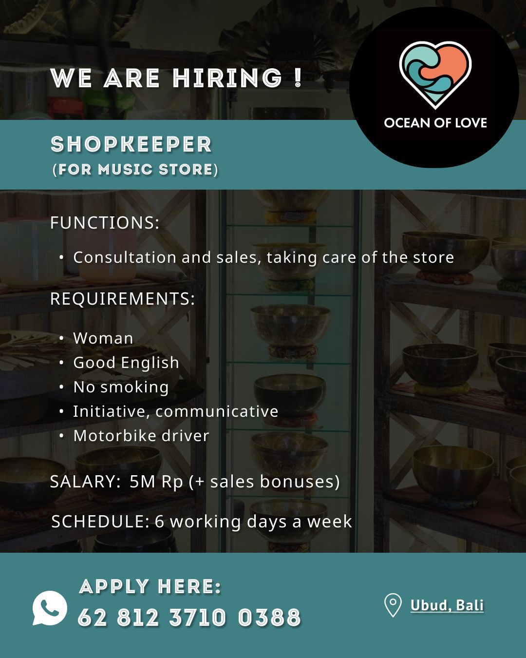 Dibutuhkan segera Shopkeeper untuk Ocean Of Love di Ubud, Bali.
