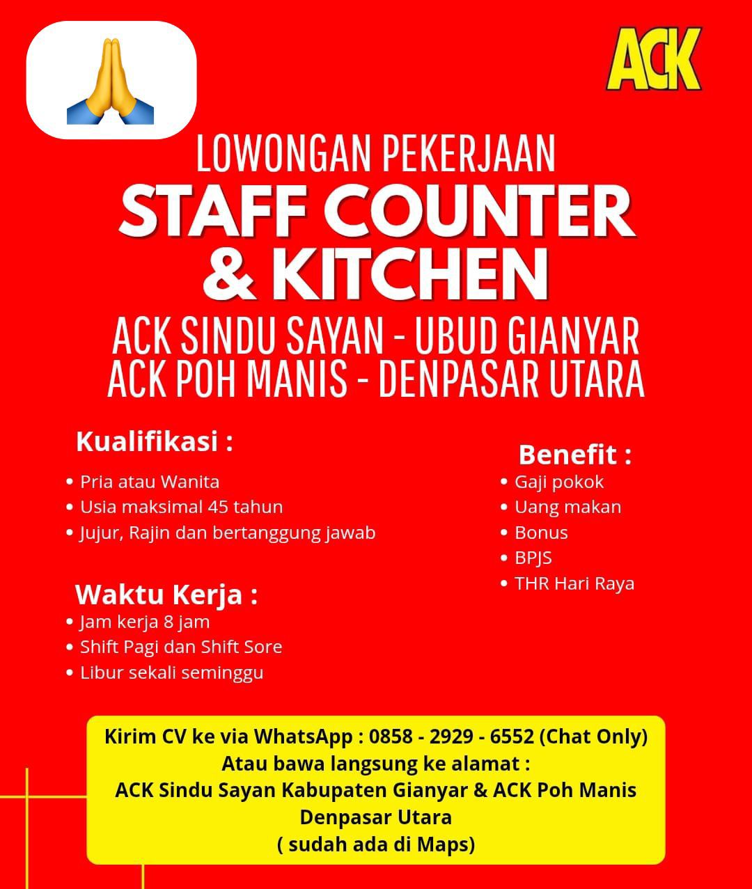 Lowongan Pekerjaan Staff Counter dan Kitchen 👨🍳 ACK Sindu Sayan Ubud Gianyar & ACK Poh Manis Denpasar Utara 💼