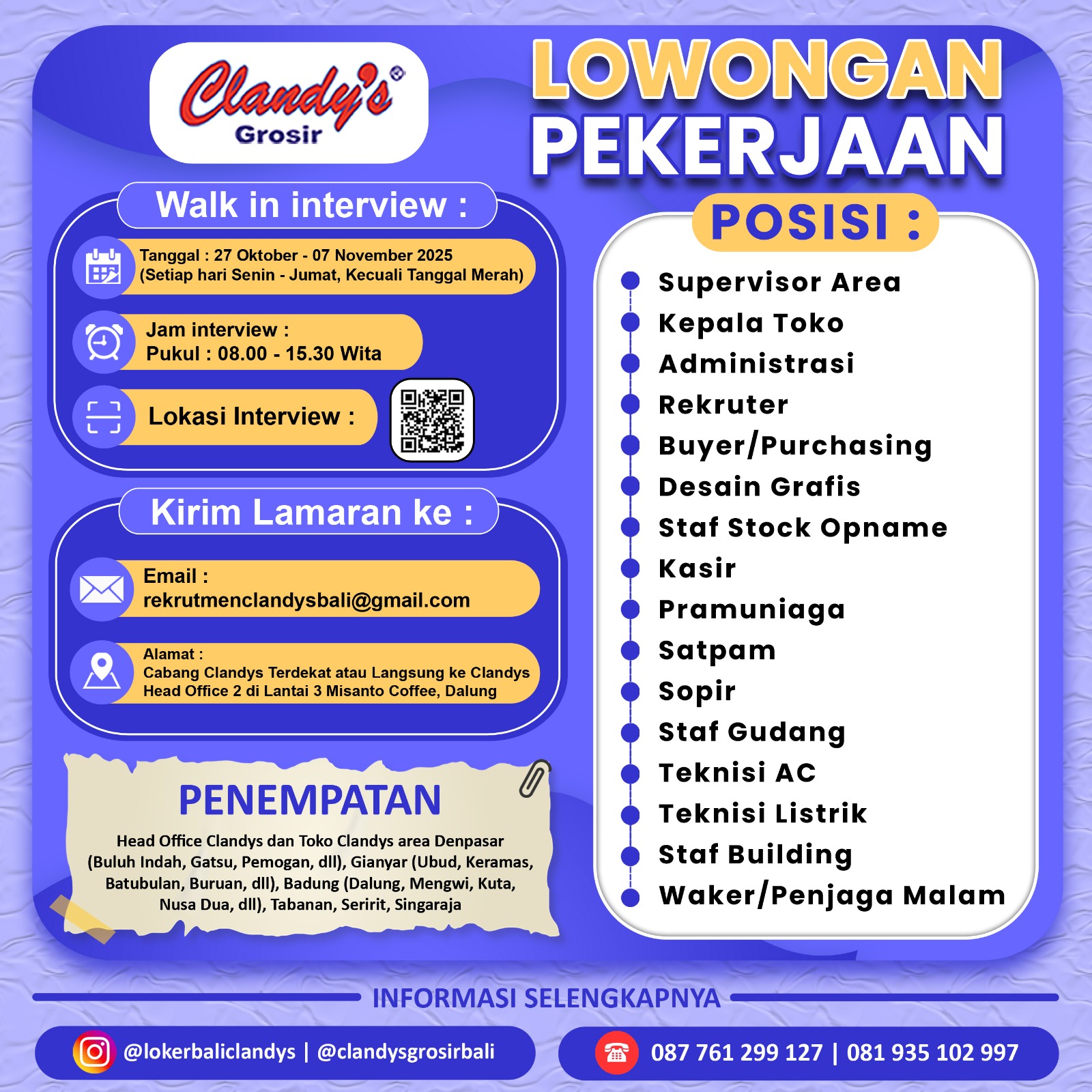 Untuk info lebih lanjut silahkan cek sosial media kami @lokerbaliclandys dan @clandysgrosirbali